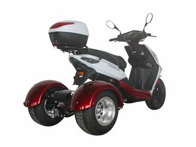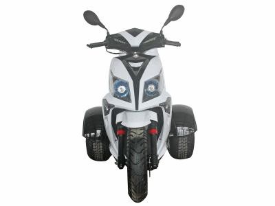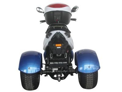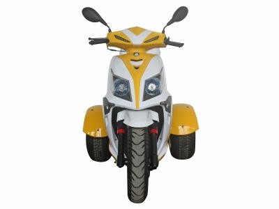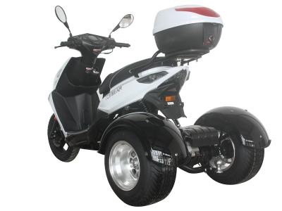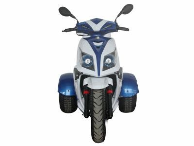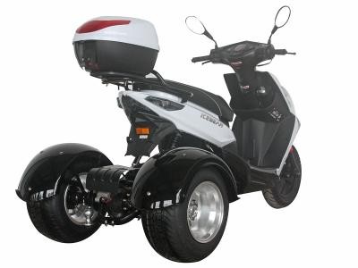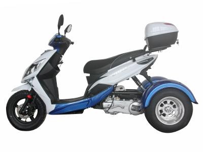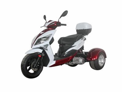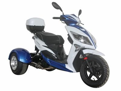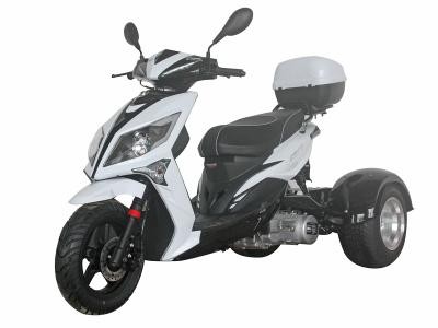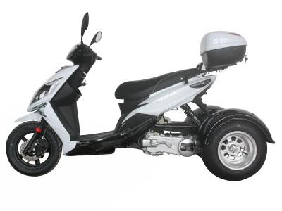The Icebear 150cc Mojo Trike features an air cooled, four-stroke single cylinder 150cc engine. It features automatic transmission. It includes a CDI start system and front and rear disc brakes, and a top speed of 49 MPH.